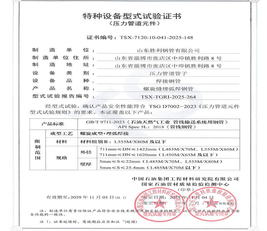 2025 年 11 月 4 日,公司順利取得了型式試驗(yàn)證書(shū),新型式試驗(yàn)證書(shū)的范圍如下:5mm ≤壁厚≤ 22mm ( 鋼 級(jí) L485M/X70M、555M/X80M)、5mm ≤壁厚≤ 25.4 mm(L485M/X70M 以下鋼級(jí)),為公司后續(xù)大壁厚、高鋼級(jí)產(chǎn)品投標(biāo)做好準(zhǔn)備。